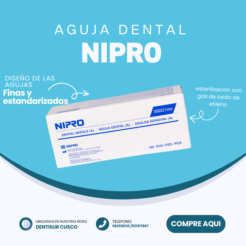 Las agujas dentales Nipro son dispositivos estériles de un solo uso, fabricados en acero inoxidable con triple biselado y recubrimiento de silicona, diseñadas para una punción suave, precisa y de baja molestia en anestesia infiltrativa o troncular. Compatibles con jeringas carpule, garantizan seguridad y alta calidad.
