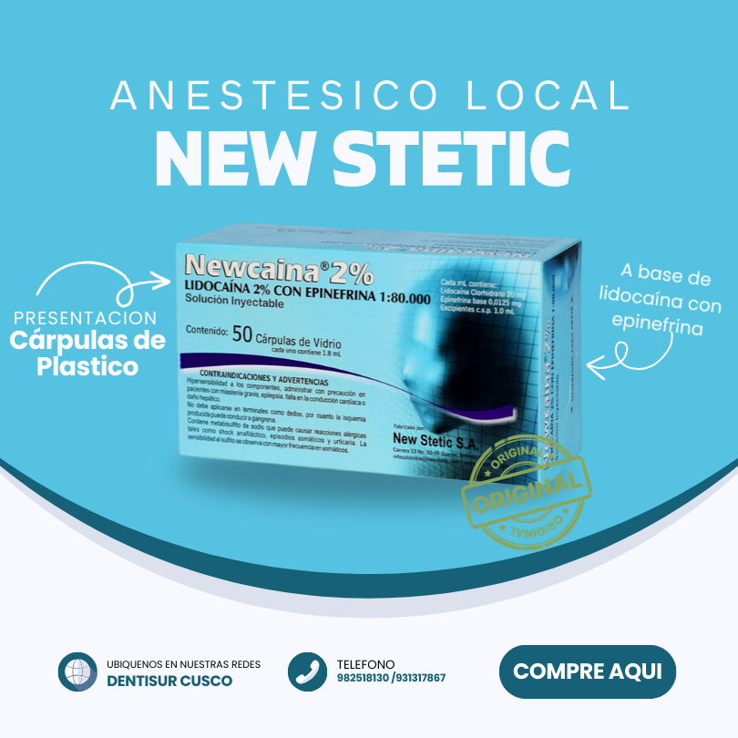 Los anestésicos locales de New Stetic son soluciones inyectables de uso odontológico para bloqueo nervioso o infiltración, destacando la Odontocaína 3% (Mepivacaína) sin vasoconstrictor para procedimientos cortos y pacientes alérgicos/asmáticos, y la Newcaina 2% (Lidocaína) con epinefrina (1:80.000) para intervenciones más largas y profundas, ofreciendo acción rápida y alta seguridad.