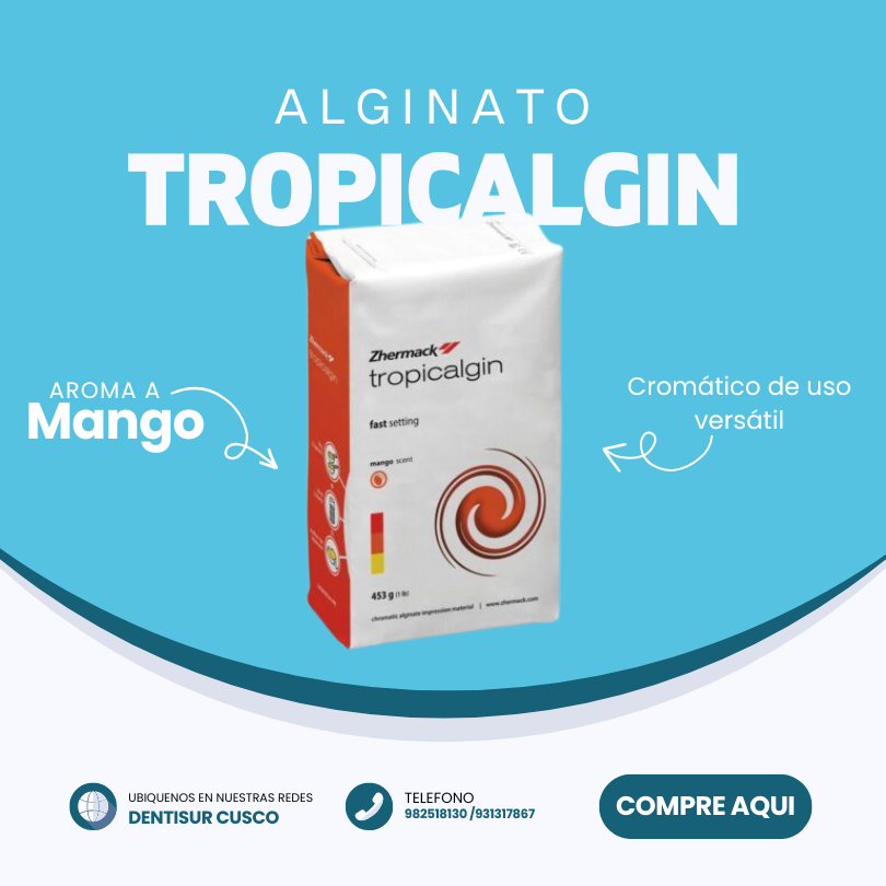 Tropicalgin de Zhermack es un alginato cromático de alta precisión, tixotrópico y libre de polvo con aroma a mango. Cambia de color para guiar la mezcla (rojo), trabajo (naranja) y posición en boca (amarillo). Ideal para modelos de estudio y prótesis.