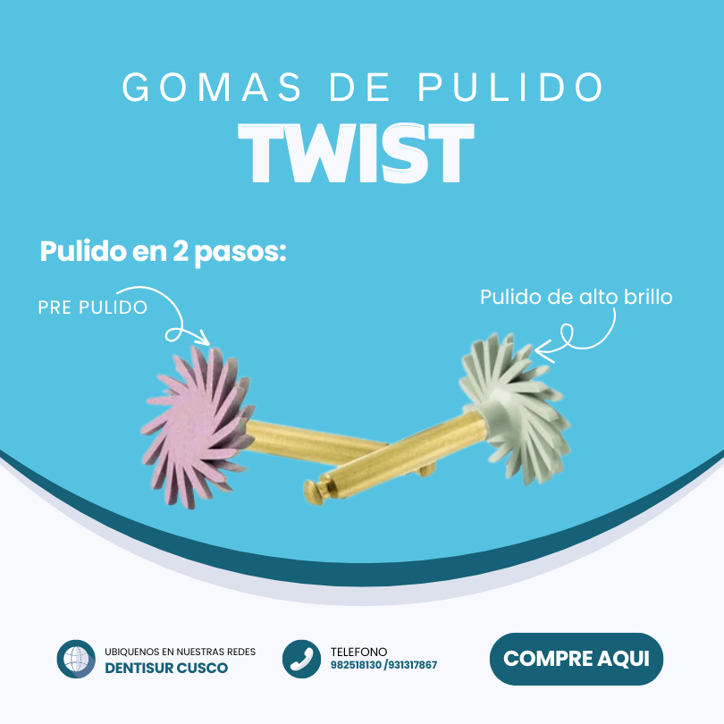 Las gomas o discos de pulido Twist (generalmente EVE o similar) son instrumentos odontológicos con forma de espiral y láminas flexibles impregnadas de diamante. Diseñadas para un pulido eficiente en dos pasos, se adaptan a cualquier morfología dental (oclusal, interproximal), logrando alto brillo en composites y cerámicas.