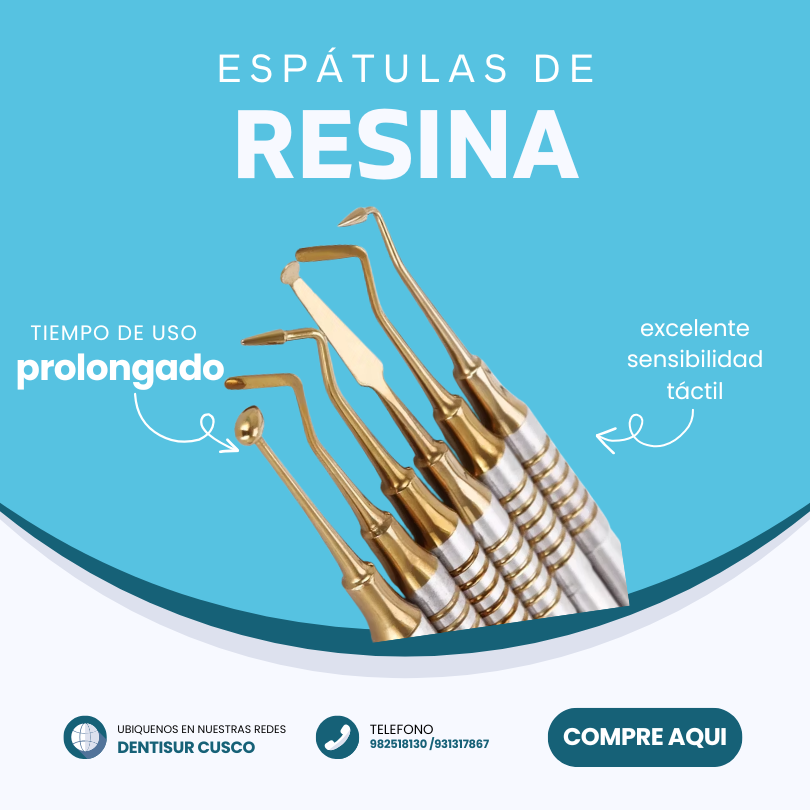 Las espátulas de resina son instrumentos odontológicos esenciales, generalmente de acero quirúrgico con puntas revestidas (titanio negro, oro o diamante) para evitar la adhesión del composite. Diseñadas para odontología restauradora, se usan para colocar, esculpir y modelar resinas compuestas, logrando contornos anatómicos precisos y superficies lisas en obturaciones y carillas.