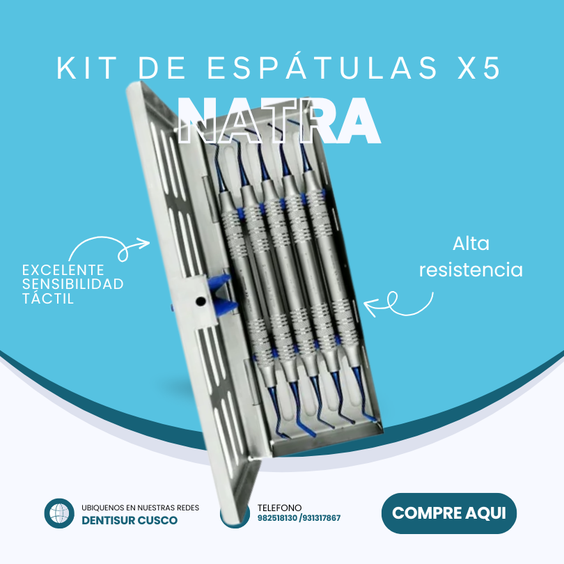 El kit de espátulas para resina marca Natra es un set premium de 5 o 6 instrumentos dentales de acero inoxidable AISI-420, con acabado azul antiadherente recubierto de titanio. Diseñadas para restauración clase I y II, estas herramientas ofrecen alta resistencia, esterilización en autoclave y puntas activas precisas para el modelado de composite.