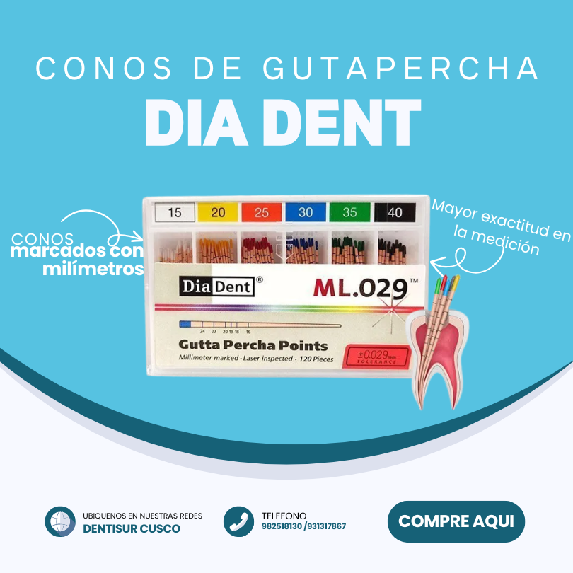 Los conos de gutapercha DiaDent son materiales de obturación endodóntica de alta calidad, diseñados para el sellado radicular. Son radio-opacos, libres de cadmio y látex, fabricados con técnica hand-rolled (enrollados a mano) para asegurar consistencia, flexibilidad y precisión dimensional. Disponibles en diversas conicidades (Taper .02, .04, .06) y tamaños (estándar ISO, ML.029) para ajustarse a la preparación del conducto.