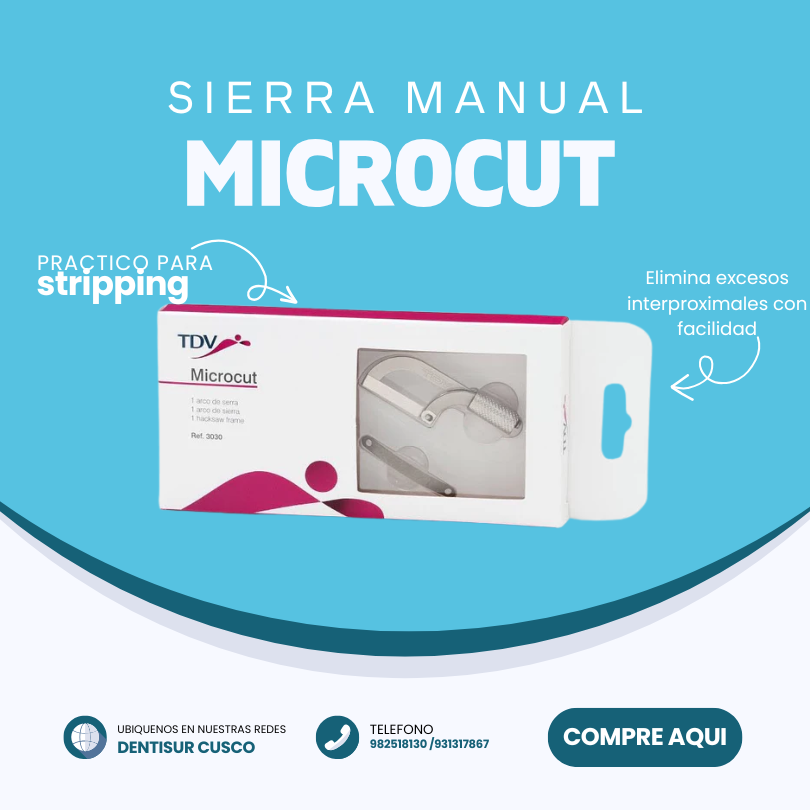 La sierra manual Microcut (TDV) es un instrumento odontológico de alta precisión diseñado para eliminar excesos de resina, adhesivo, cemento o amalgama en áreas interproximales sin dañar el punto de contacto. Posee una tira de acero inoxidable muy fina que facilita el acceso, ideal para stripping ortodóntico.