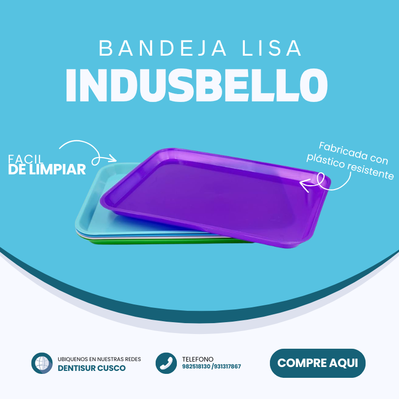 La bandeja lisa Indusbello es un accesorio odontológico y médico, fabricado en polímero resistente y atóxico, diseñado para organizar, transportar y esterilizar instrumental. Es autoclavable (hasta 135°C), ligera y presenta un diseño moderno con superficie lisa que facilita la limpieza y desinfección. Disponible en tamaños pequeño, mediano y grande.
