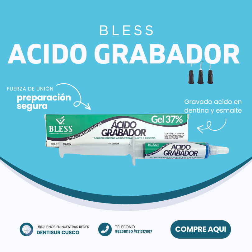 El ácido grabador dental, comúnmente ácido fosfórico al 35-37% en gel, es un agente químico utilizado para crear microporosidades en el esmalte y la dentina, permitiendo una adhesión mecánica duradera de resinas, sellantes y cementos. Se aplica por 15-30 segundos para aumentar la retención y el éxito de restauraciones